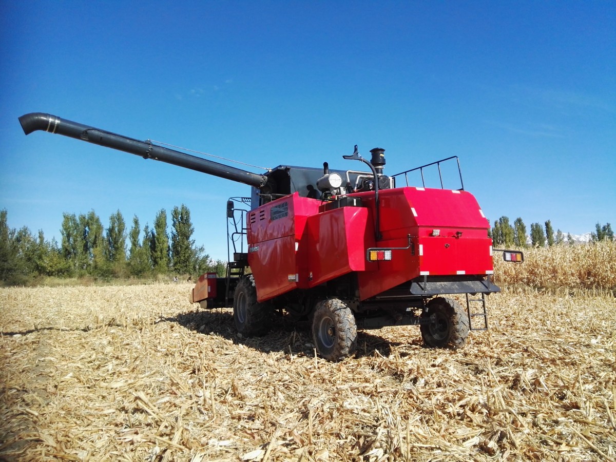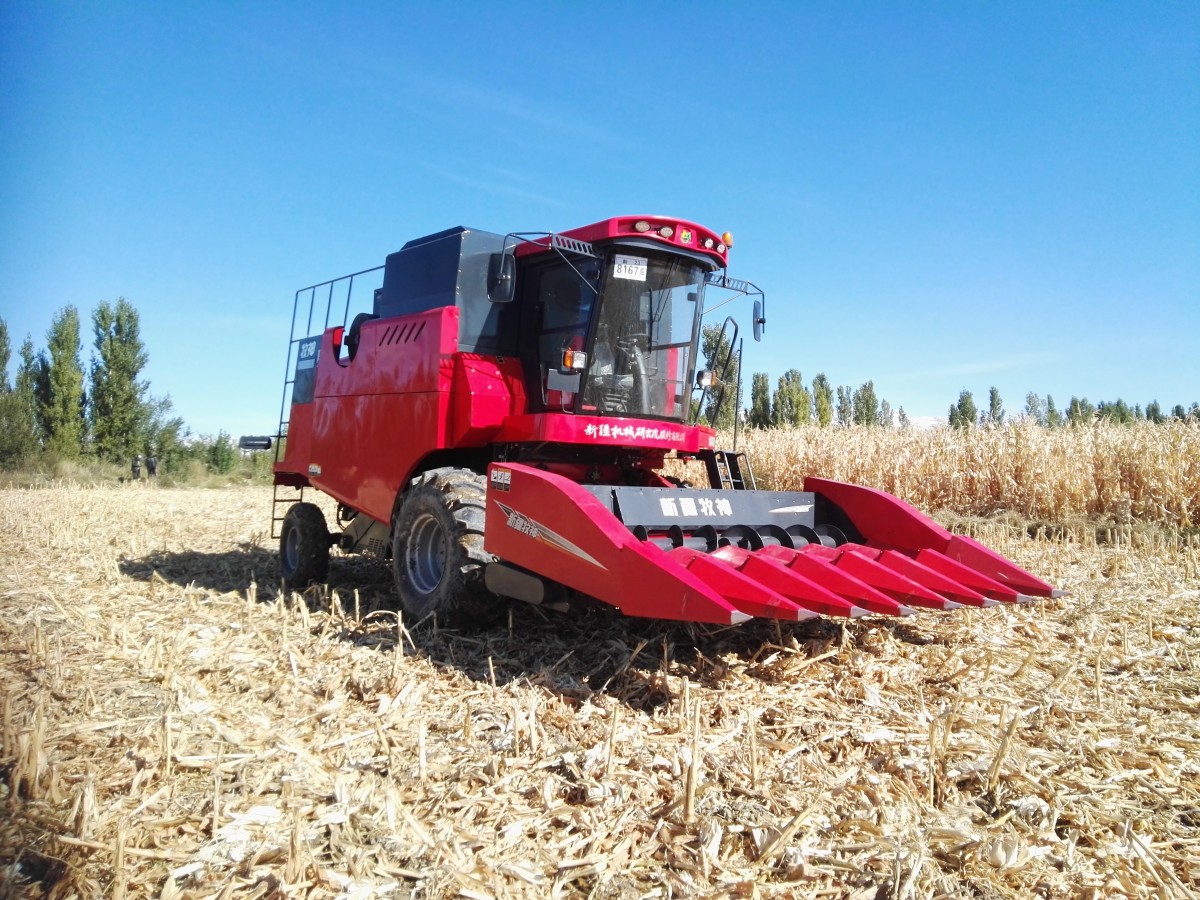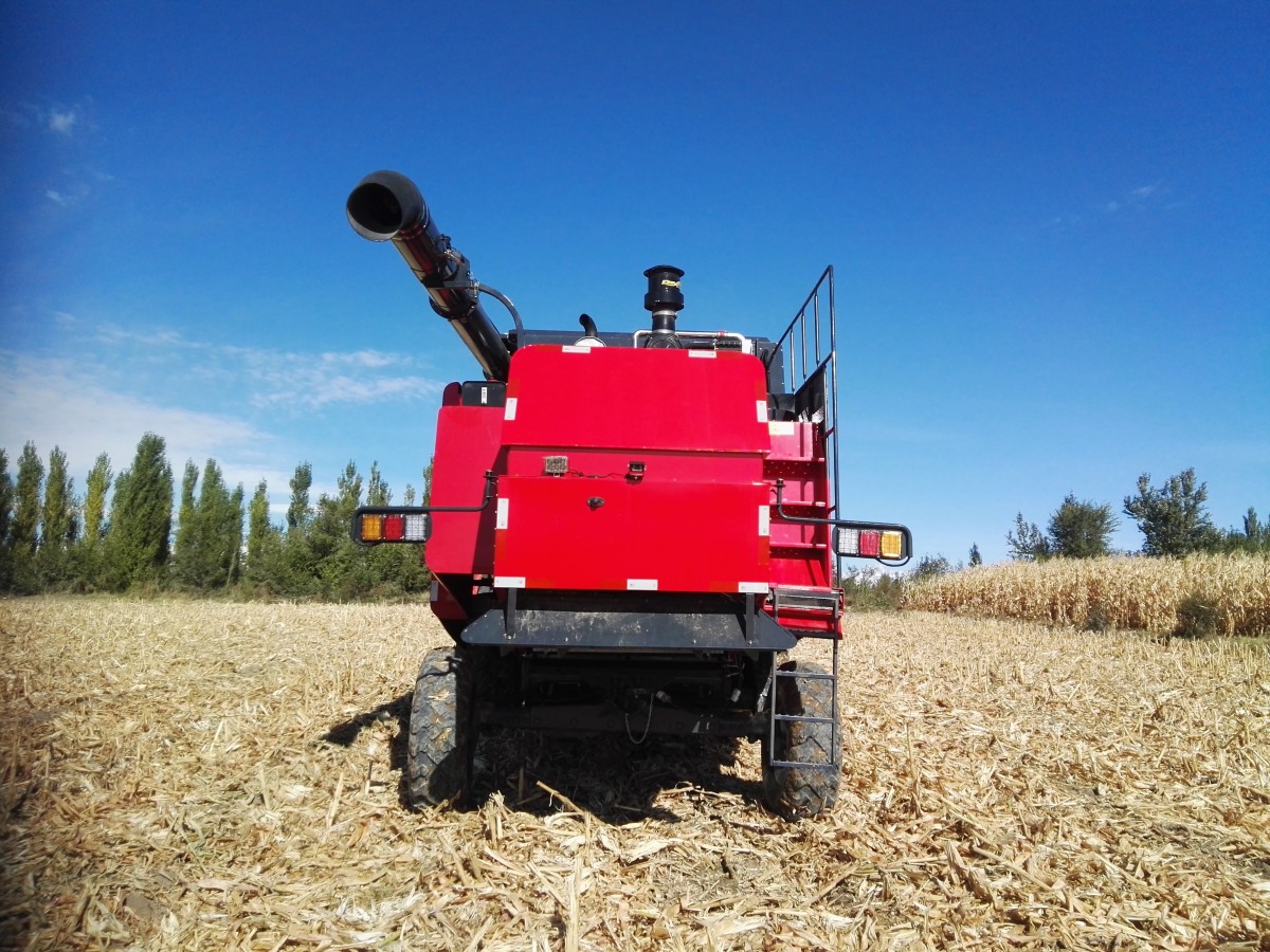 可挂接7、8行不同行距的玉米割台和4.57米割副的小麦刚性割台和不同割副的大豆挠性割台,采用世界先进的全轴流脱粒分离滚筒技术,一次作业可完成对玉米等农作物的收割、脱粒、清选分离和谷物卸粮运送,通过更换不同的脱粒滚筒、分离装置和收割割台,可以实现对小麦、水稻等农作物进行机械化作业,其有一机多用、性价比高、适应性强、作业效率高、破损率低、总损失率小、收割效果好等优点。